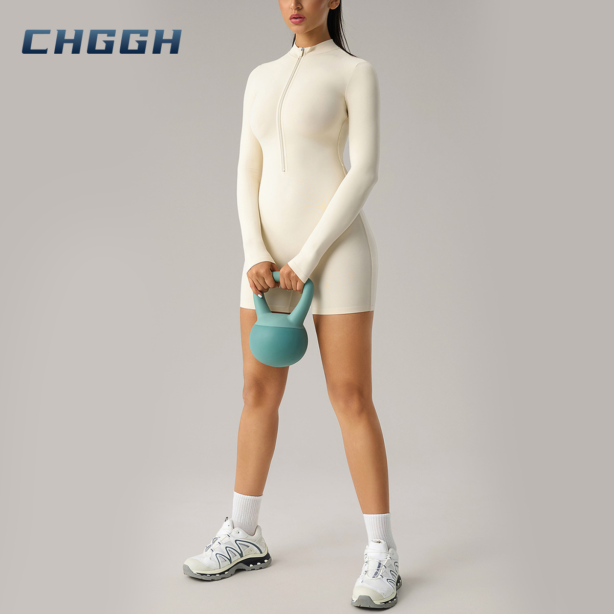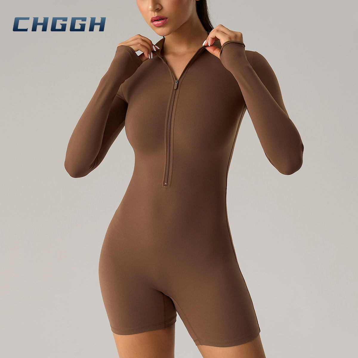 Description: Crafted from premium ultra-stretch fabric, this long-sleeve romper eliminates garment shifting. The biker-short length and integrated thumbholes offer functional coverage, perfectly fusing high-performance athletic utility with a refined, sculpting aesthetic.
