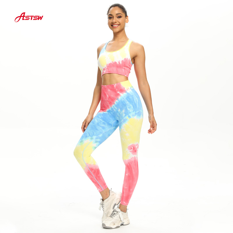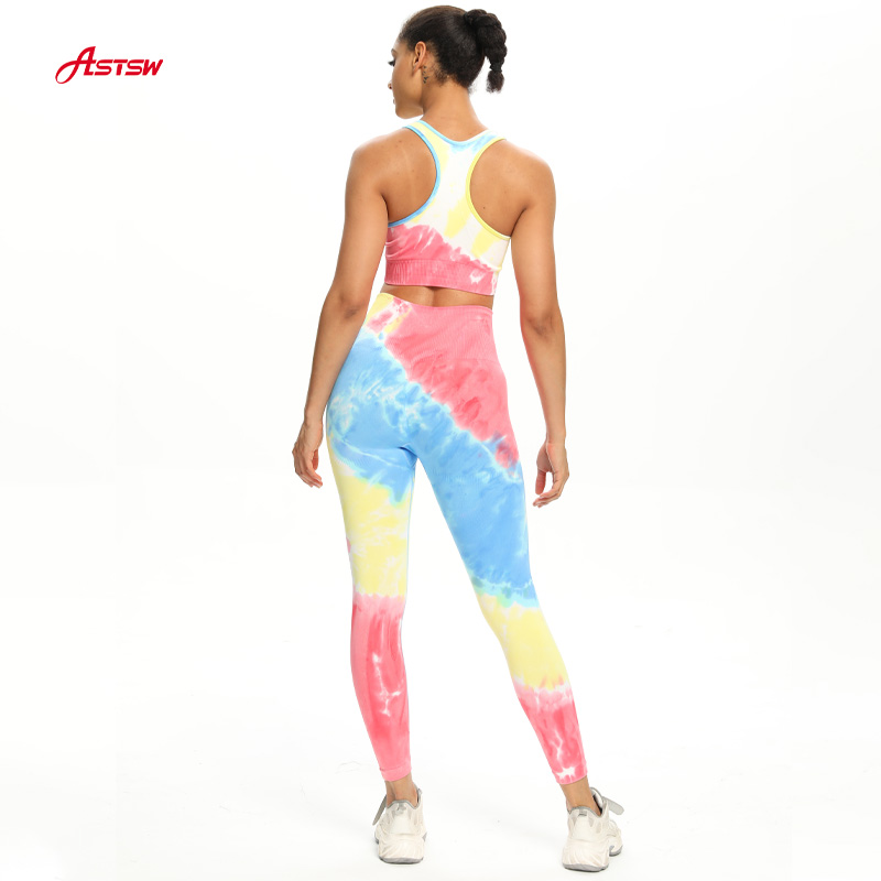 Seamless sportswear collection. This seamless racerback sports bra and high rise leggings featuring on colorful tie-dye pattern.