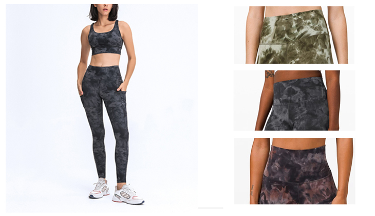 The materials composition of the sports clothing is including 80% Nylon and 20% Polyester. This kind of active wear is unique that its special pattern is made by tie-dye, like the ink dribble onto the the drawing paper. Besides its unique and fancy design, the tie-dye sports bra and leggings is more comfortable to wear as its soft and elastic feature .