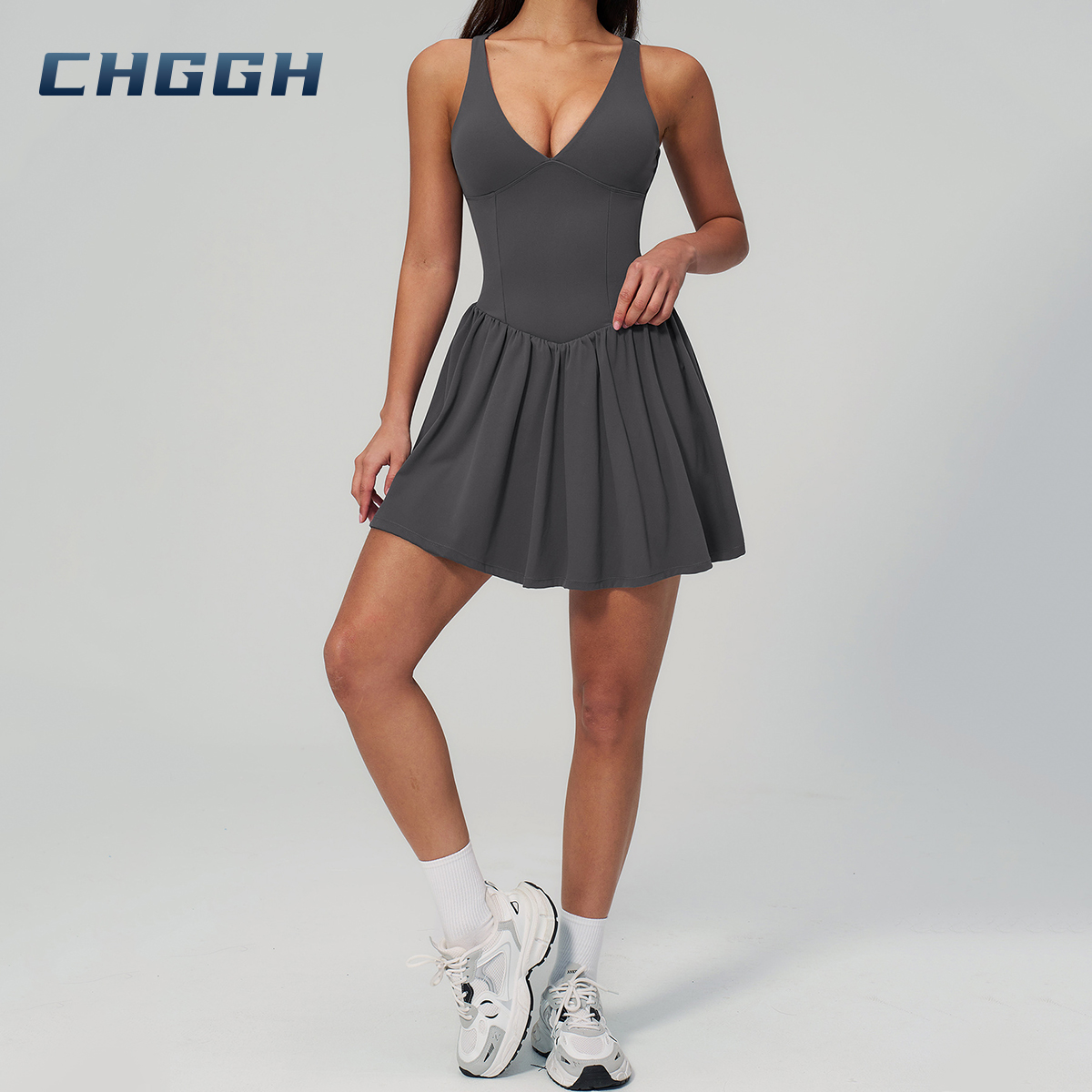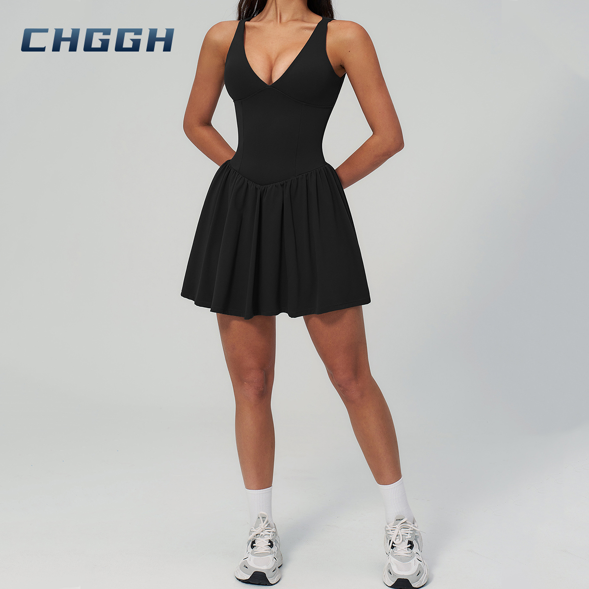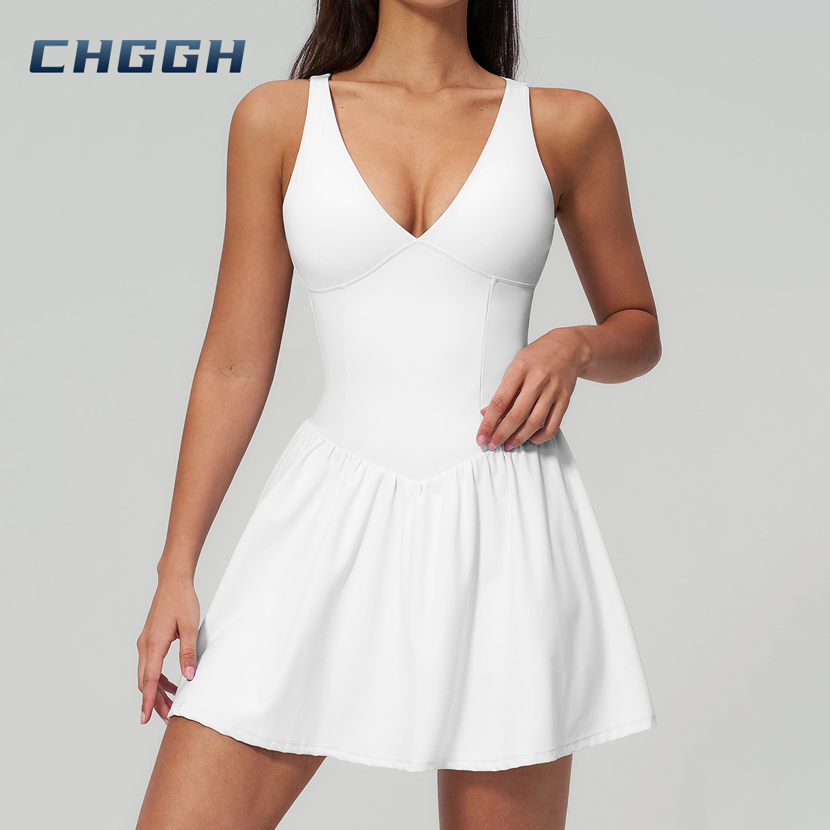 At CHGGH, we believe your activewear should seamlessly blend performance with personal style. Our premium V-neck active dress features a sculpting bodice and a fluid flared skirt, expertly engineered to support every movement—from the tennis court to the city streets.