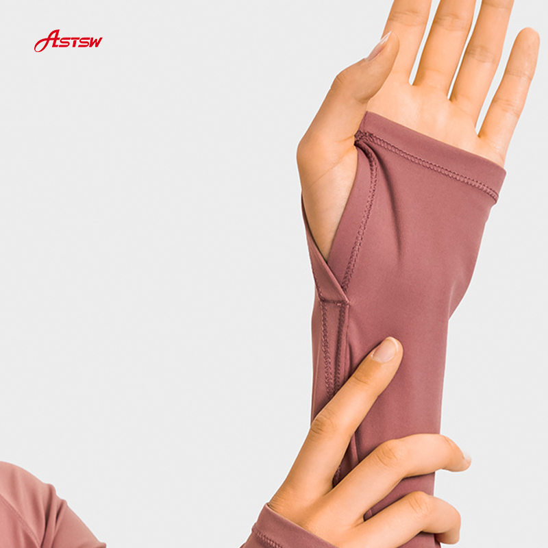 Our Women's Round Neck Long Sleeve Yoga Top,the color is simple, but it looks comfortable. You have glove on your hand sleeves so that your clothes won't run away during exercise. At the same time, you don't have to worry about your fingers, our clothes are elastic enough.