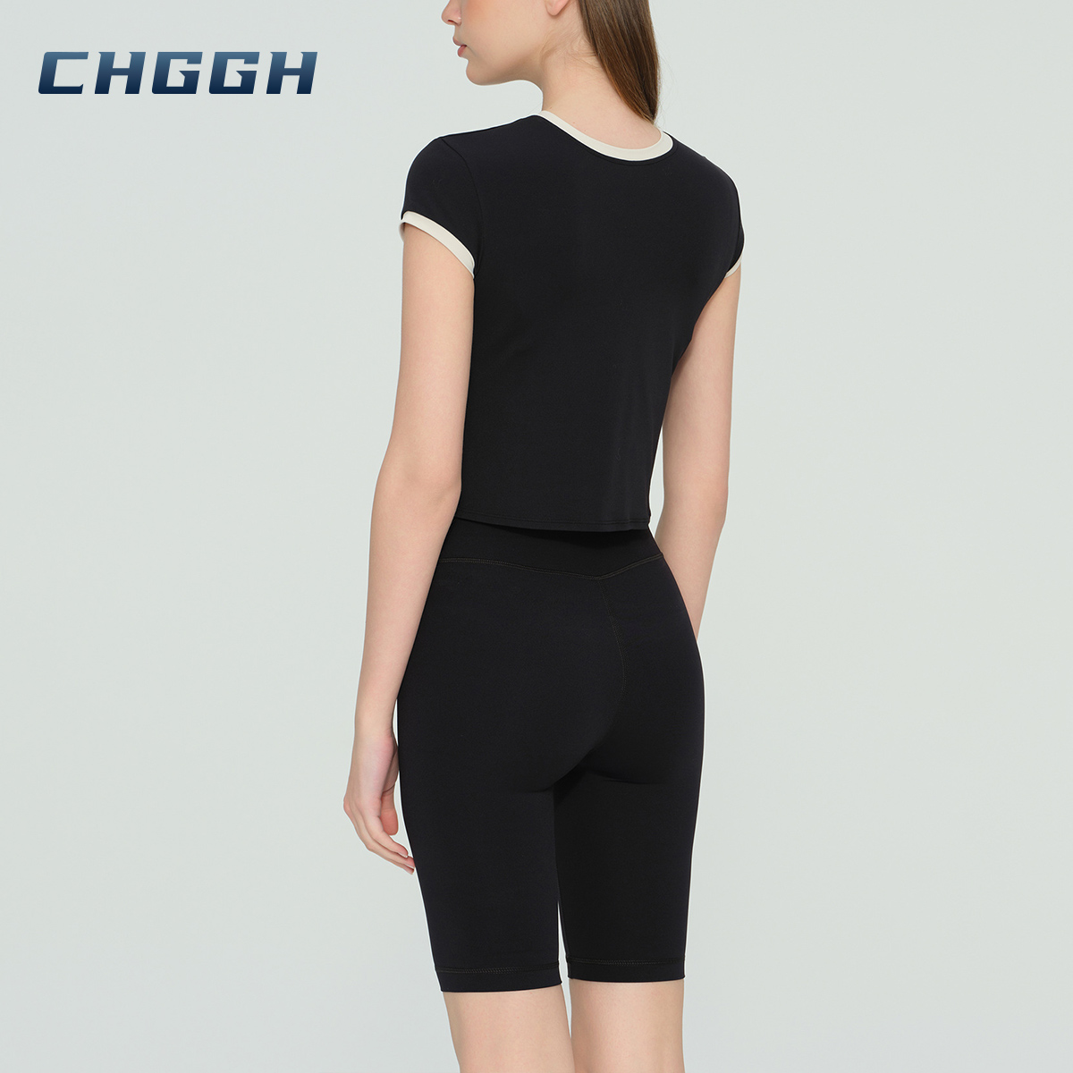This yoga set features short sleeves and contrast trim details. The form-fitting design offers comfort and flexibility, making it perfect for yoga, gym sessions, or casual active outings.